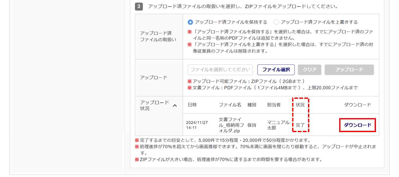 なお、ZIPファイルが大きい場合、処理進捗が70%に達するまでお時間を要する場合があります。