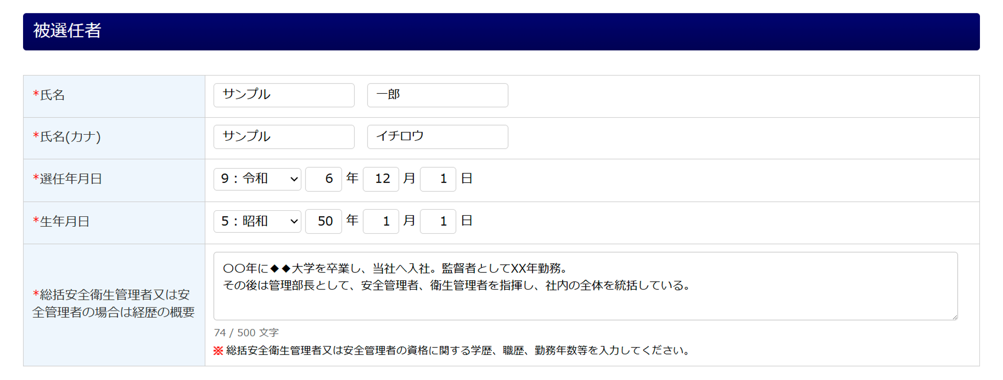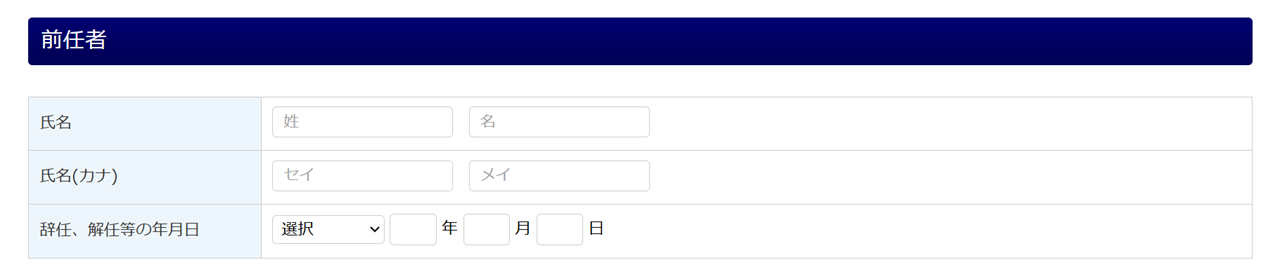 総括安全衛生管理者が交代した場合に、「前任者」の情報を入力します。