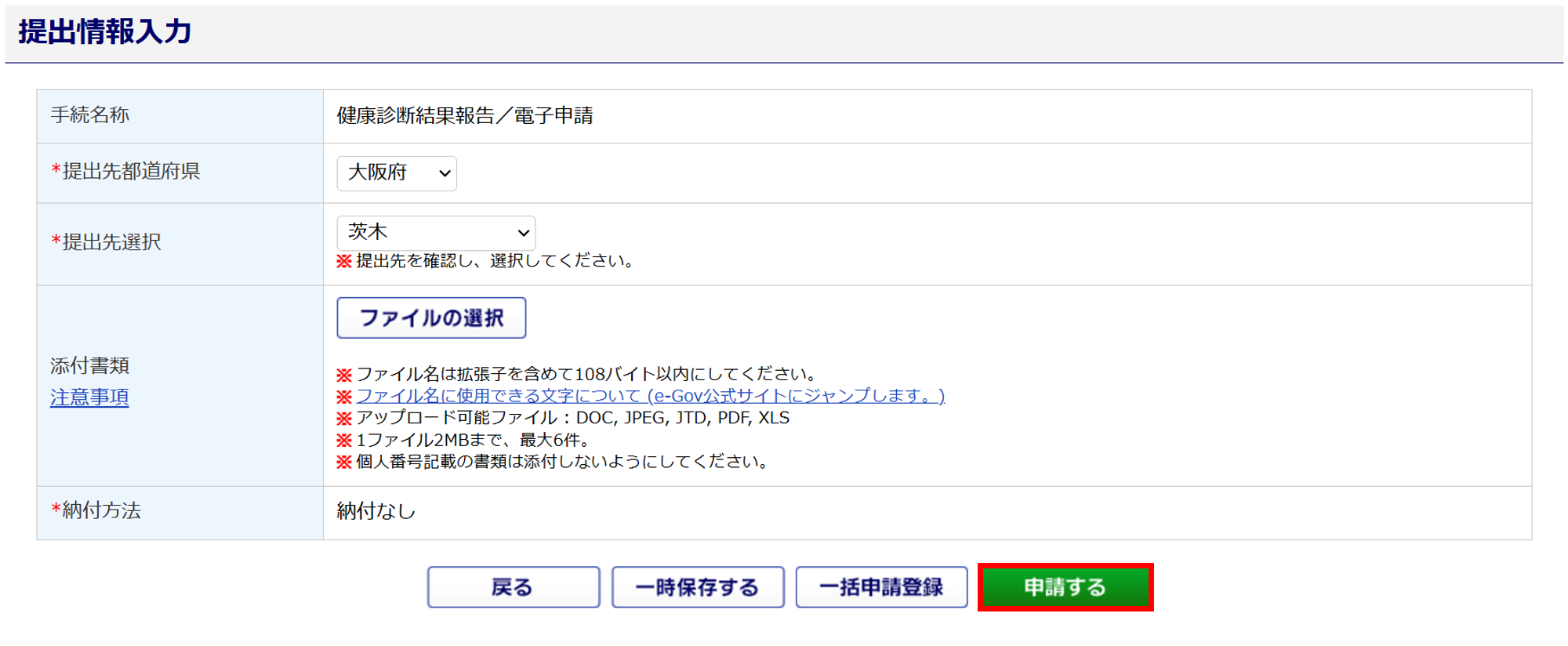 システム上でご案内している「アップロード可能ファイル」については、あくまでもオフィスステーションにアップロードできるファイル形式です。公共職業安定所への電子申請など、e-Gov経由で電子申請をおこなう場合、手続きごとに添付できるファイル形式が異なりますので、ご注意ください。