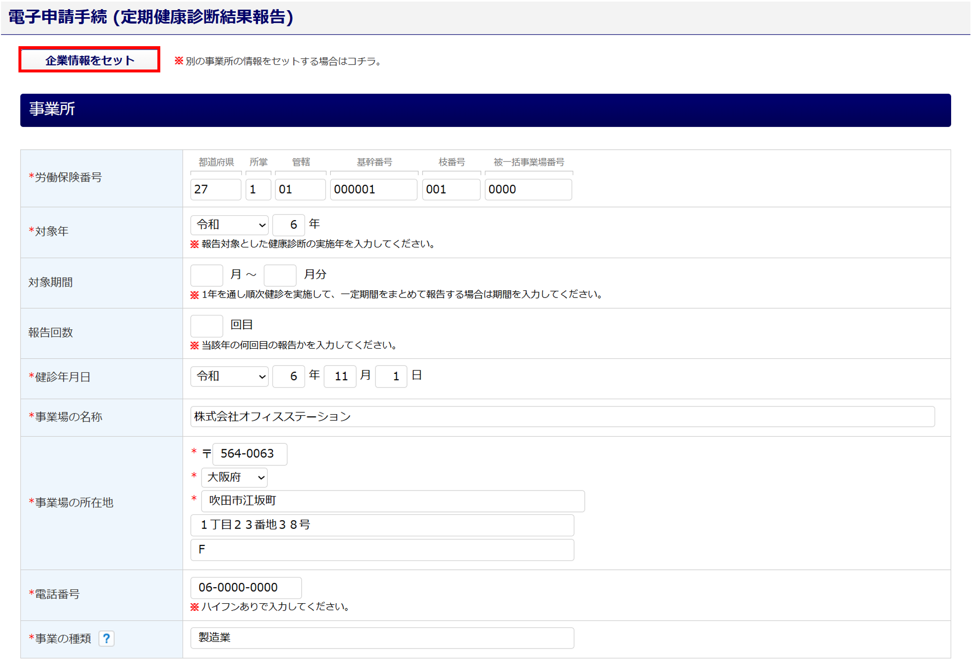 事業所欄などへ引用する内容を[他事業所管理]に登録している情報へ変更する場合は、[企業情報をセット]をクリックします。
