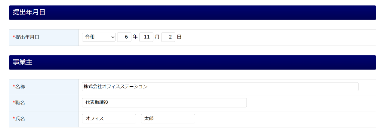 提出年月日および事業主欄へ引用されている内容を確認、必要に応じて修正します。