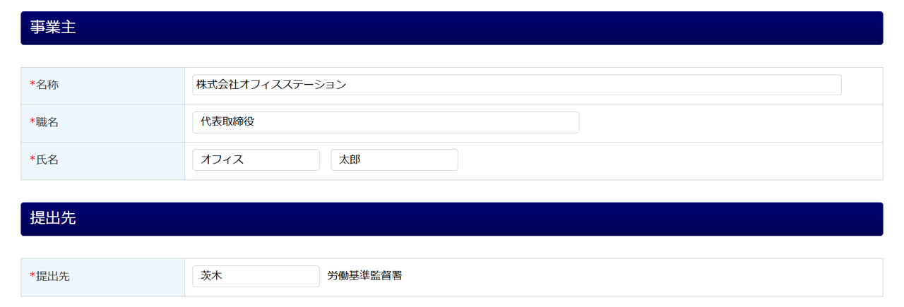 事業主および提出先の情報は、「企業設定」もしくは、「士業用顧問先管理」の情報を引用しています。