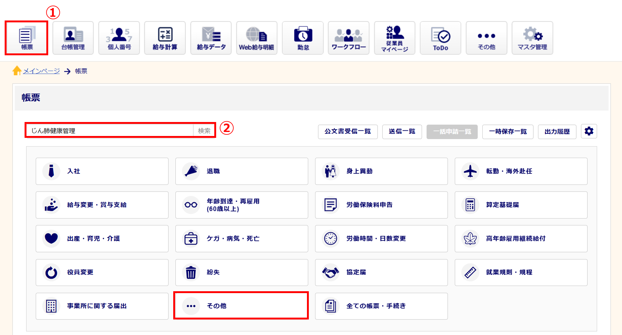 [帳票](①)をクリックし、検索窓(➁)に帳票名または帳票名の一部を入力し[検索]をクリックします。