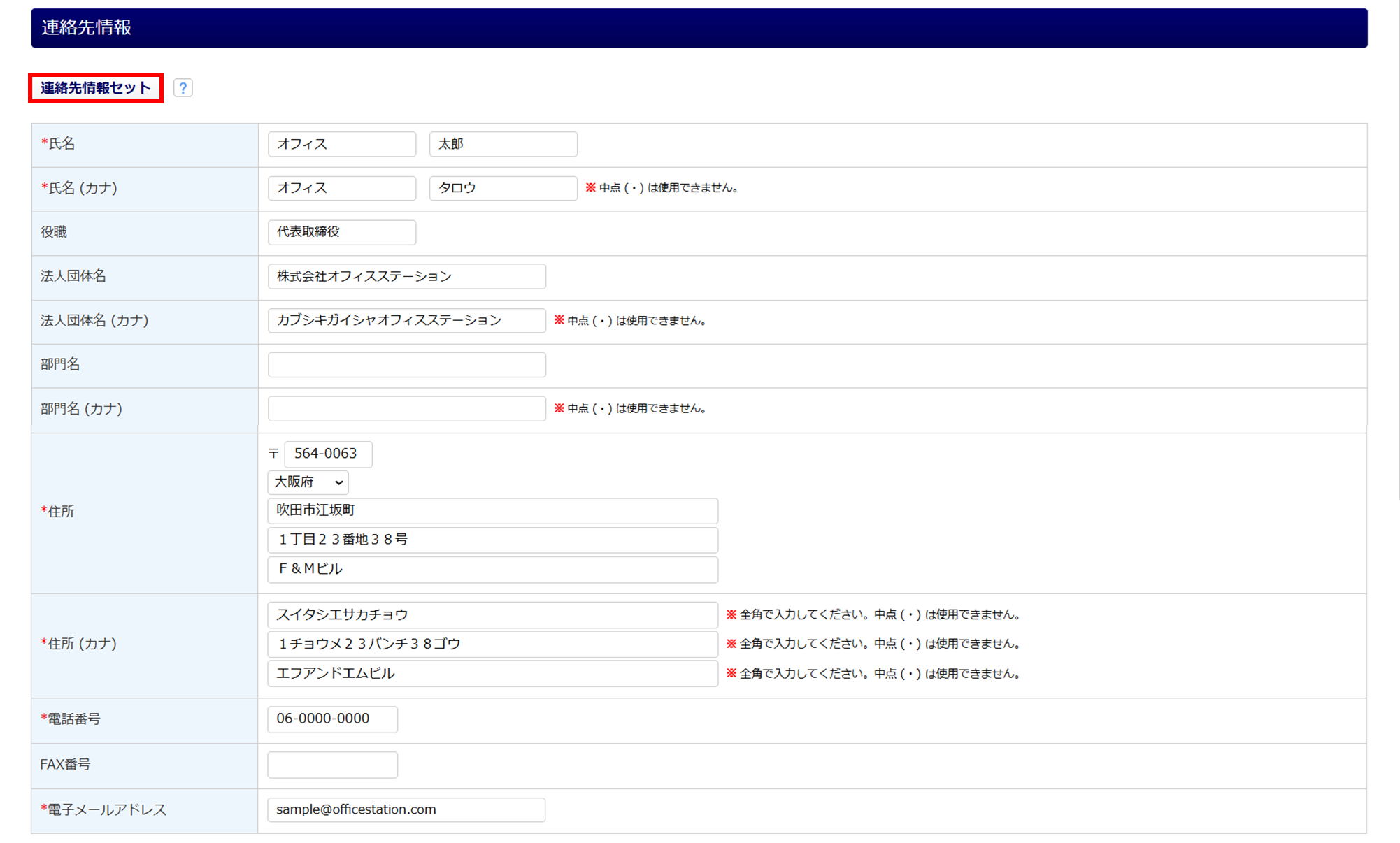 [連絡先情報セット]をクリックすると、「企業設定」もしくは「事務所設定」に登録している連絡先情報を引用します。