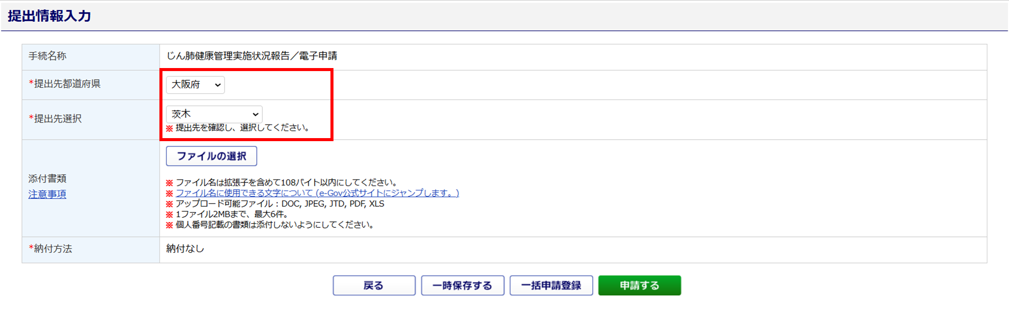 システム上でご案内している「アップロード可能ファイル」については、あくまでもオフィスステーションにアップロードできるファイル形式です。e-Gov経由で電子申請をおこなう場合、手続きごとに添付できるファイル形式が異なりますので、ご注意ください。