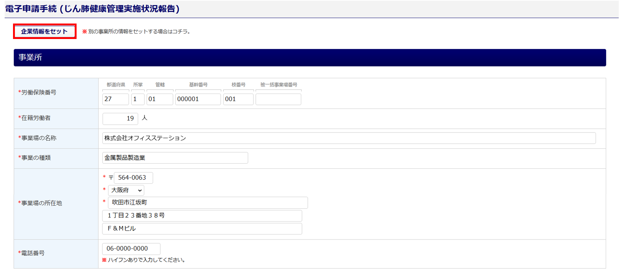 引用する内容を[他事業所管理]に登録している情報へ変更する場合は、[企業情報をセット]をクリックします。
