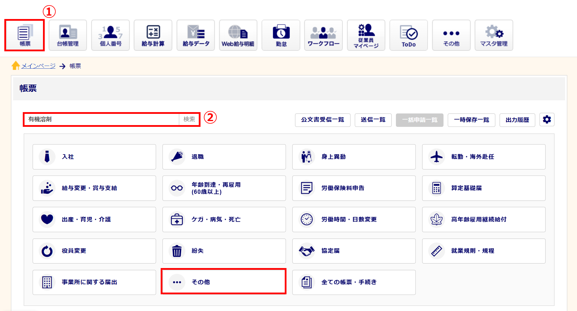 [帳票](①)をクリックし、検索窓(➁)に帳票名または帳票名の一部を入力し[検索]をクリックします。