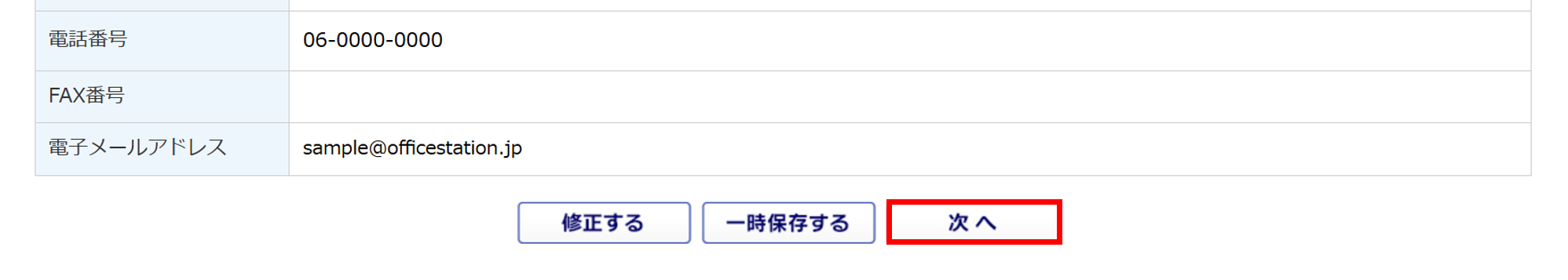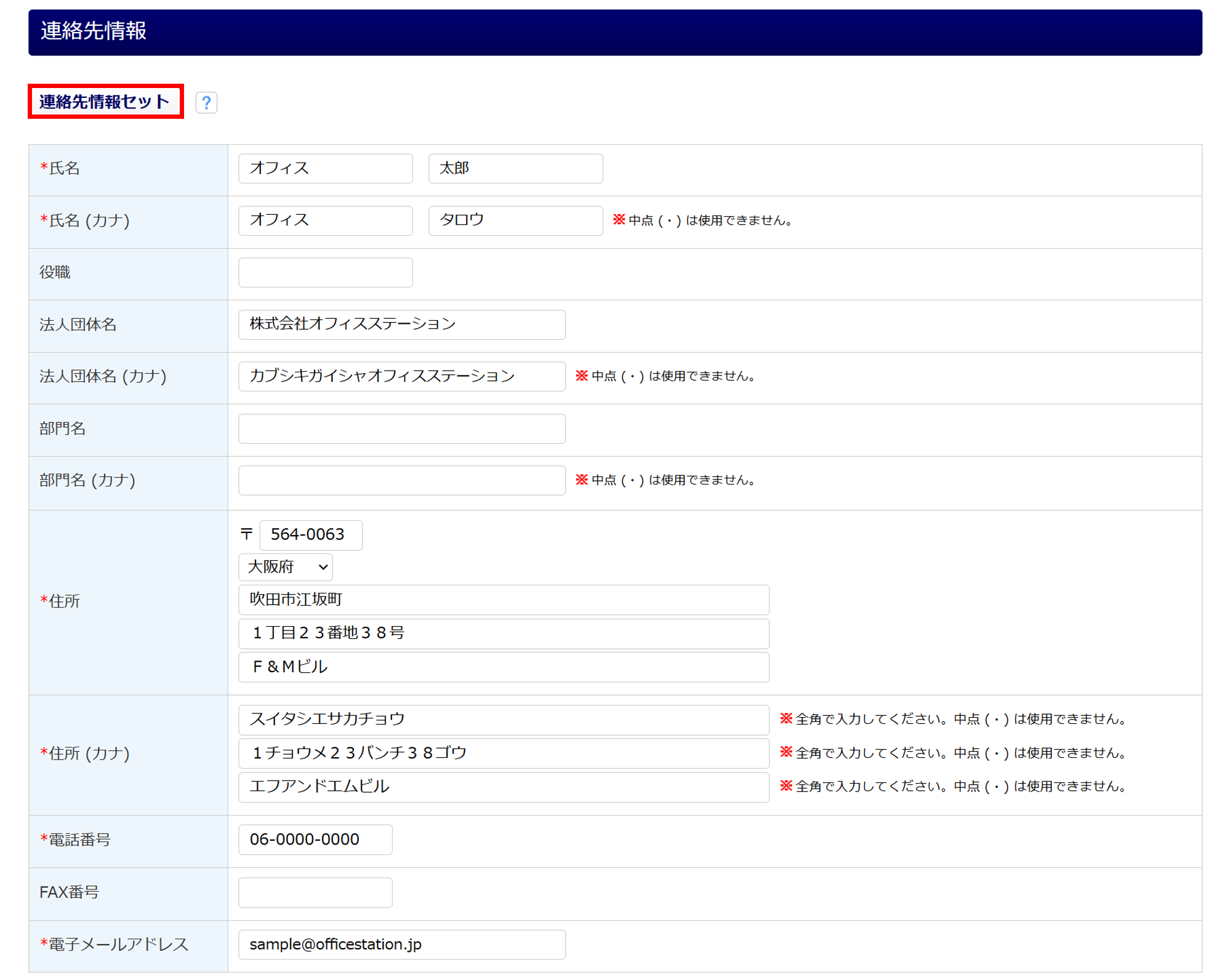 [連絡先情報セット]をクリックすると、「企業設定」もしくは「事務所設定」に登録している連絡先情報を引用します。
