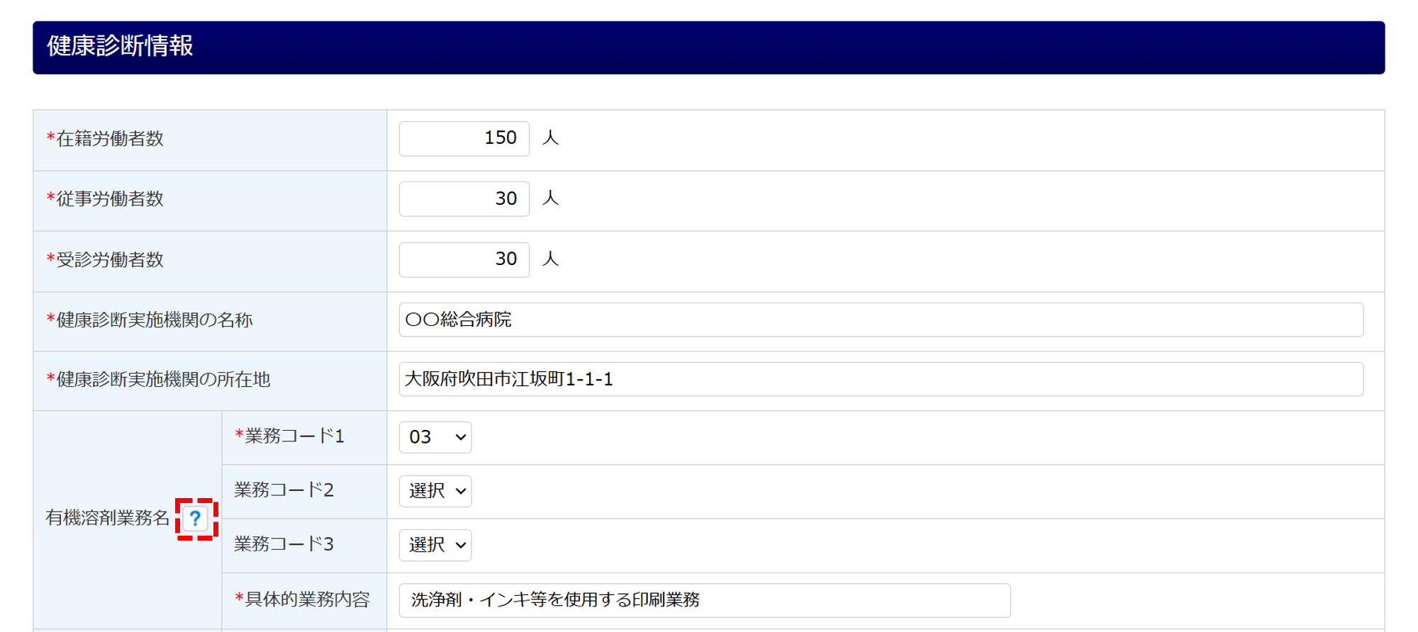 ※[?]をクリックすると、有機溶剤業務コードについて確認できます。
