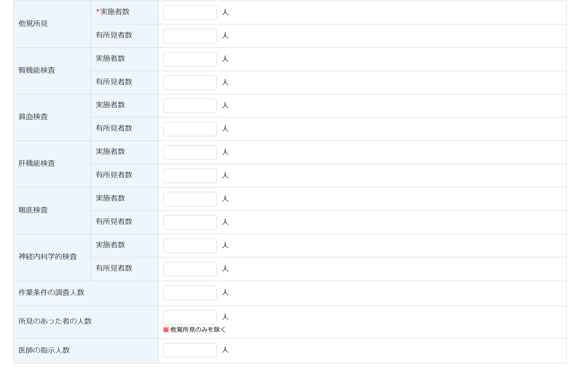 各検査項目ごとの「実施者数」と「有所見者数」を入力します。