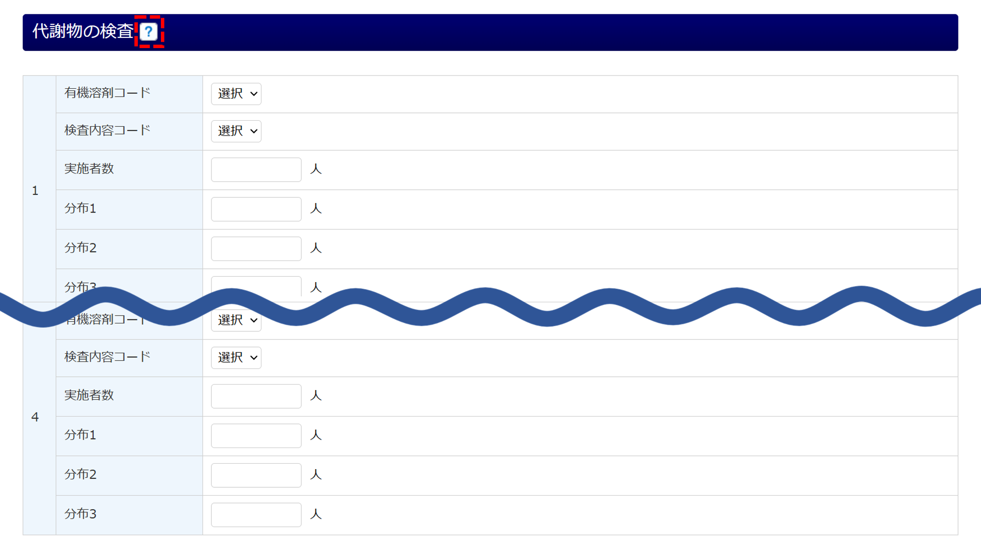 ※[?]をクリックすると、「有機溶剤コード」「検査内容コード」「分布」について確認できます。