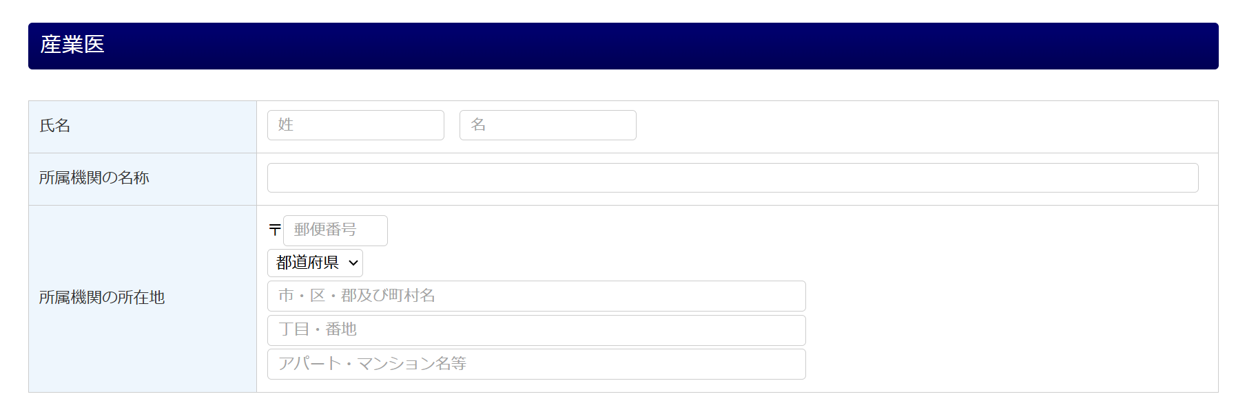 選任している産業医の氏名、所属先、所在地を入力します。