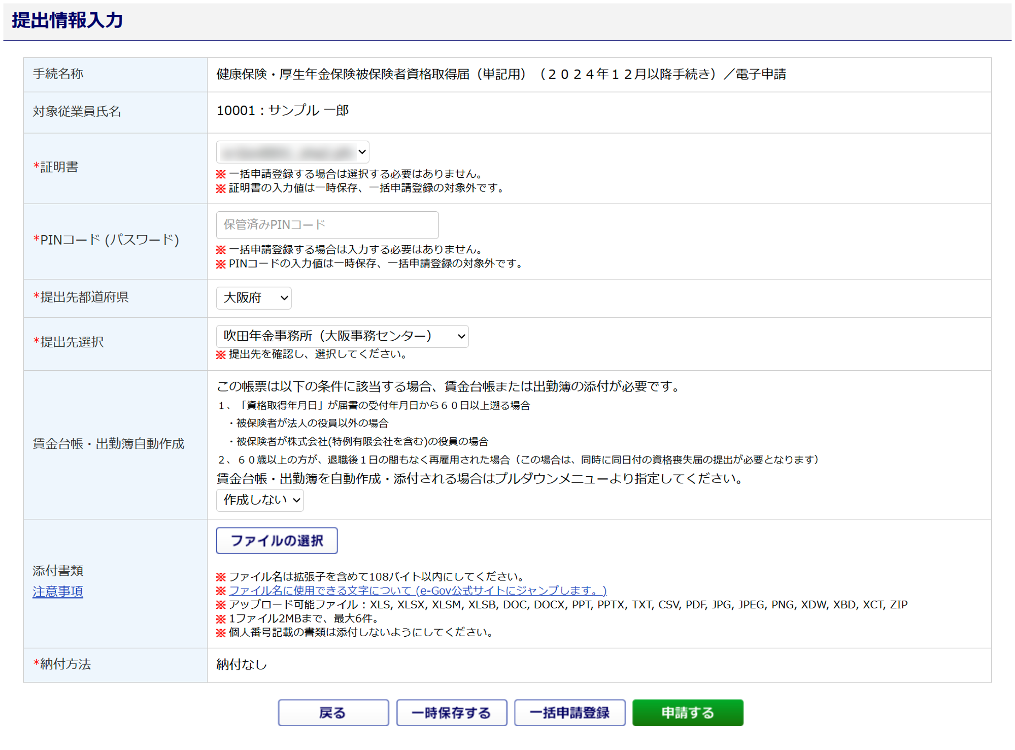 帳票によって、各手続きの申請データを登録し、一括で電子申請をおこなうことのできる[一括申請登録]、各手続きの入力時に申請データを一時保存できる[一時保存する]のボタンが表示されます。