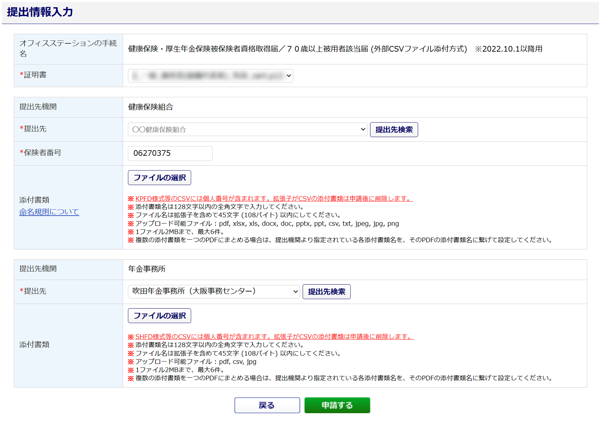 | 提出先機関 | 自動的に「年金事務所」と表示されます。 |