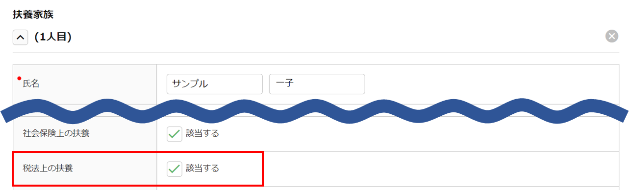 扶養家族項目にて、「税法上の扶養」の「該当する」をチェックします。