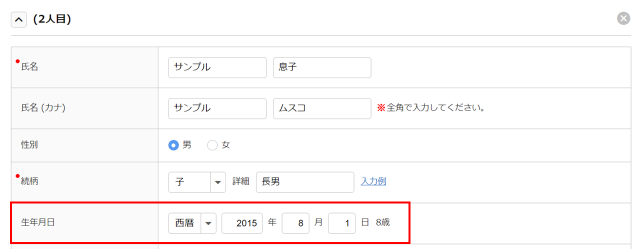 扶養家族項目にて、「生年月日」を設定します。