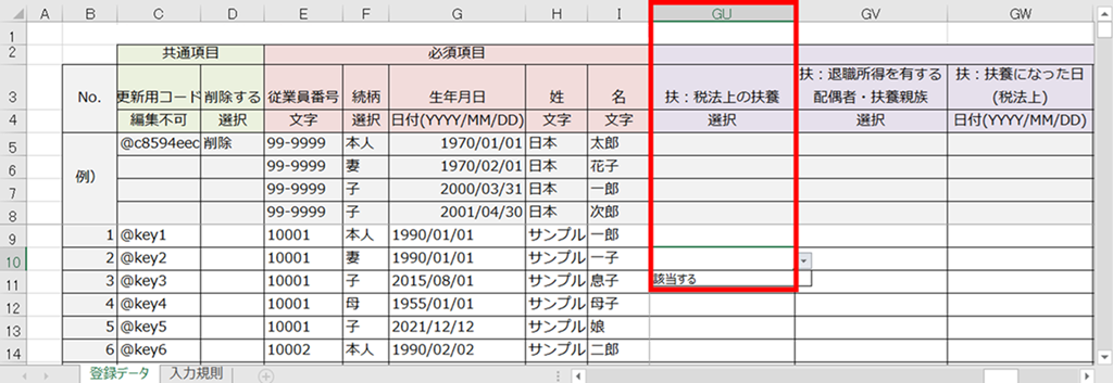 対象の扶養家族のGU列「扶:税法上の扶養」にプルダウンより「該当する」を選択します。