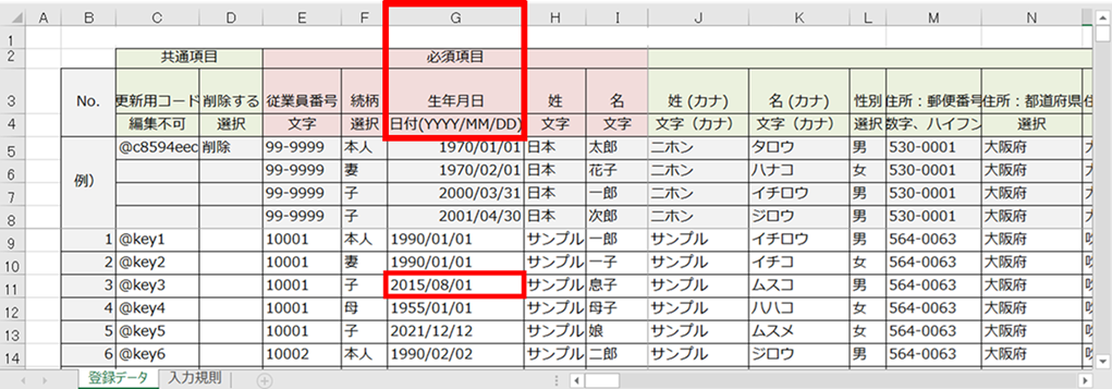 対象の扶養家族のG列「生年月日」に情報を入力します。