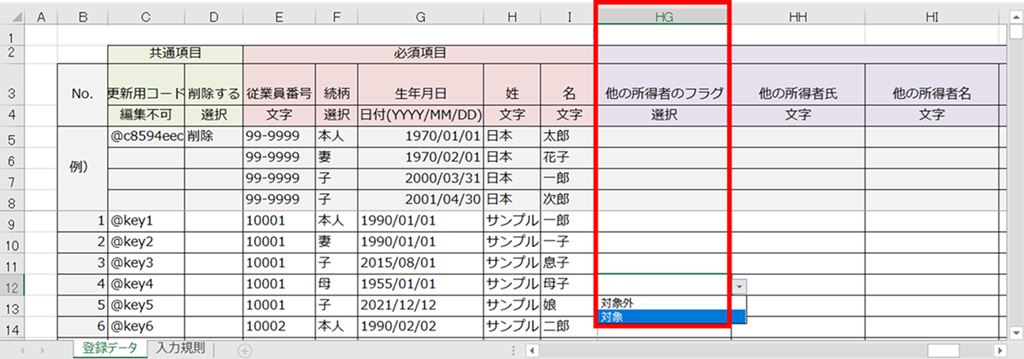 対象の扶養家族のHG列「他の所得者のフラグ」にプルダウンより「対象」を選択します。