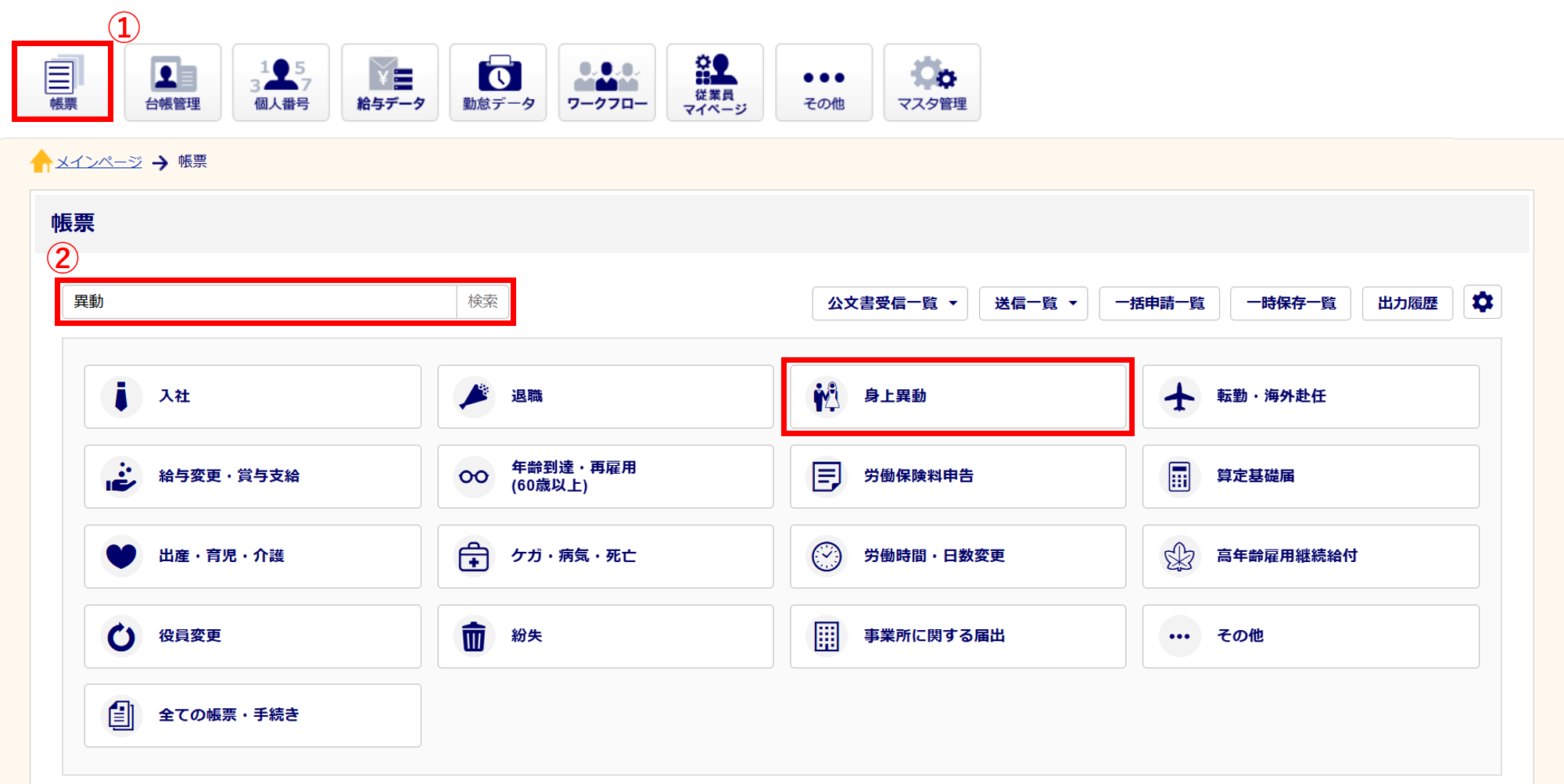 [帳票](①)をクリックし、検索窓(➁)に帳票名または帳票名の一部を入力し[検索]をクリックします。