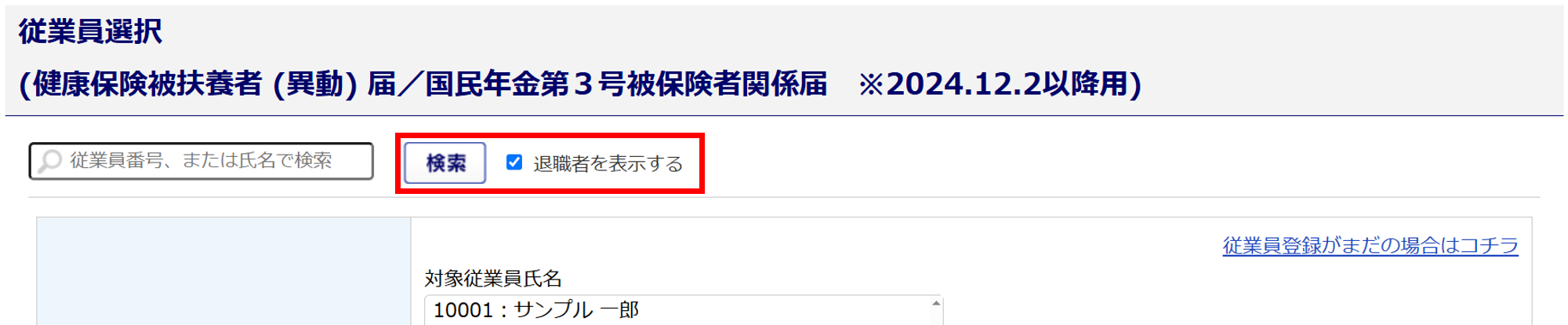 「退職者を表示する」にチェック、[検索]をクリックすると退職者が表示されます。