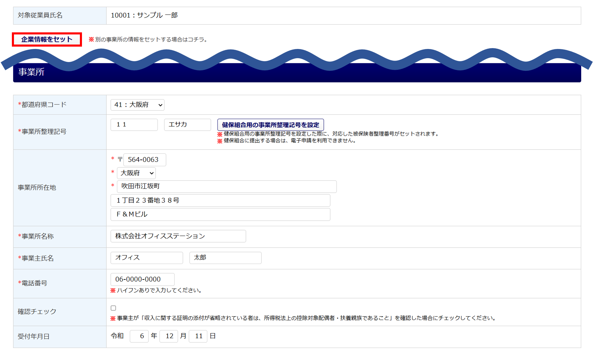事業所の情報は、「企業設定」もしくは、「士業用顧問先管理」の情報を反映しています。