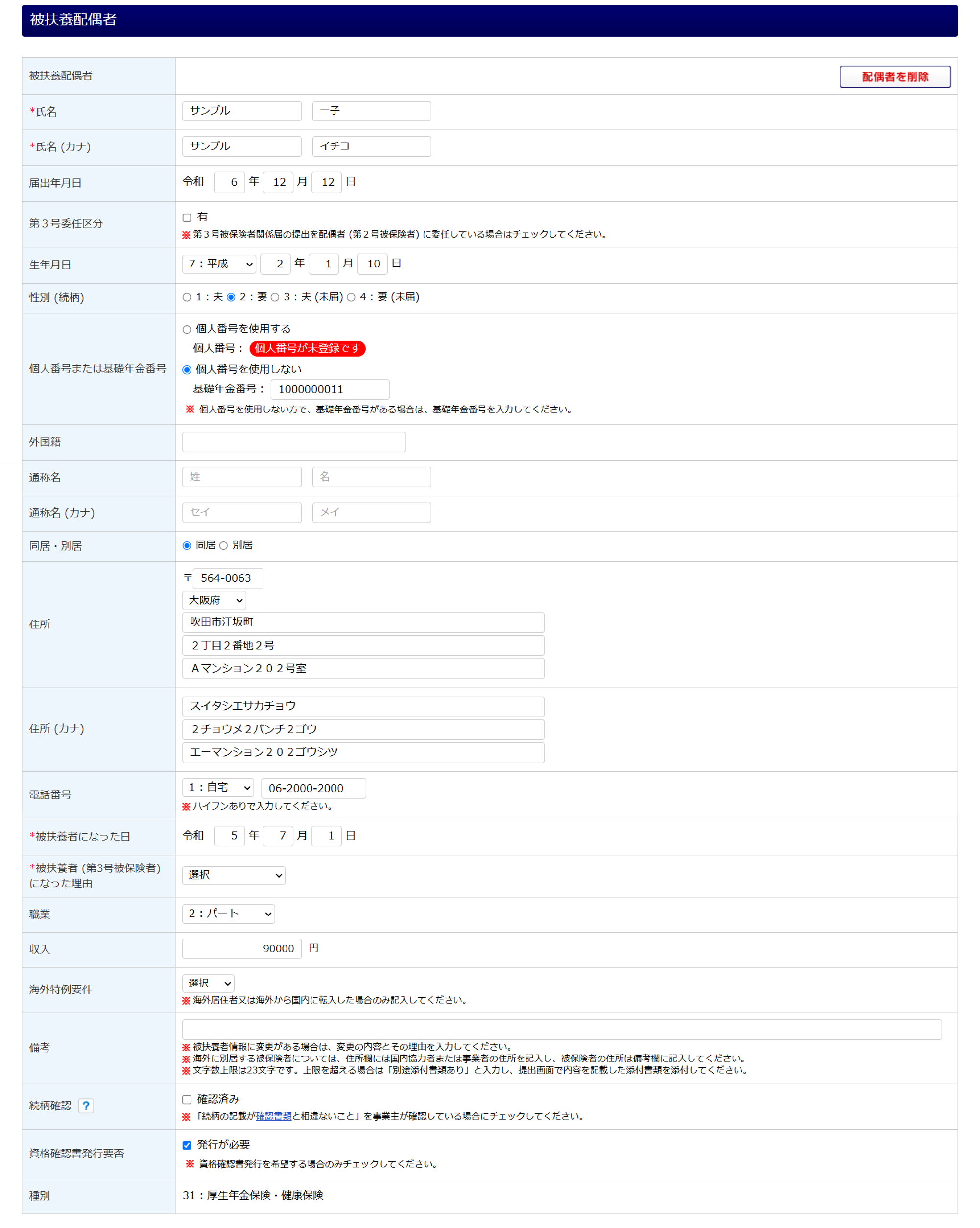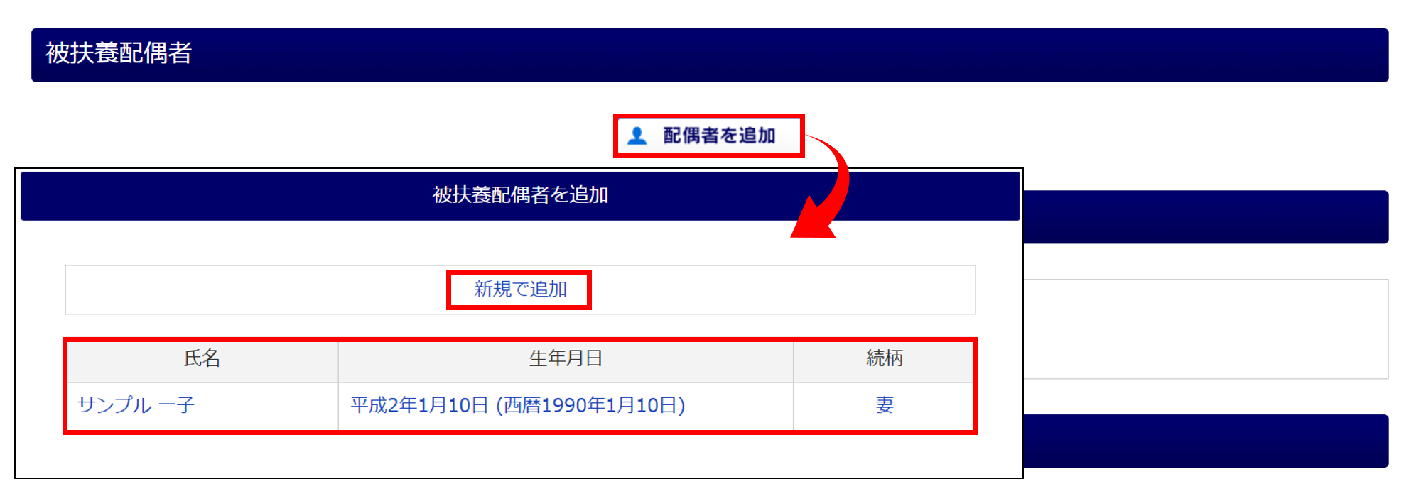 [新規で追加]をクリックした場合は、「被扶養配偶者」欄を入力します。