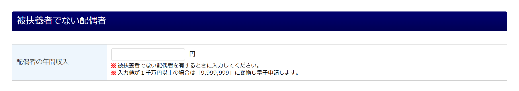配偶者が被扶養者でない場合に、「配偶者の年間収入」を入力します。
