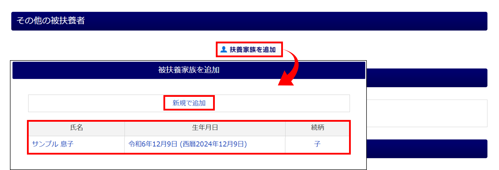 [新規で追加]をクリックした場合は、「その他の被扶養者」欄を入力します。