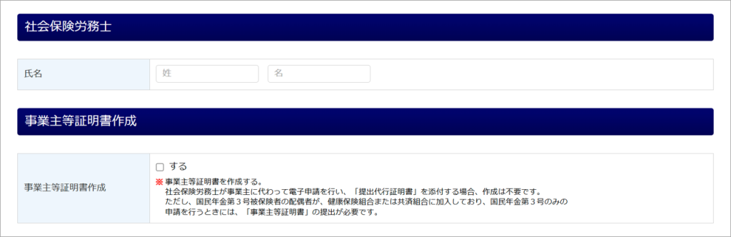 「その他の被扶養者」の下部に、「社会保険労務士」と「事業主等証明書作成」が表示されます。