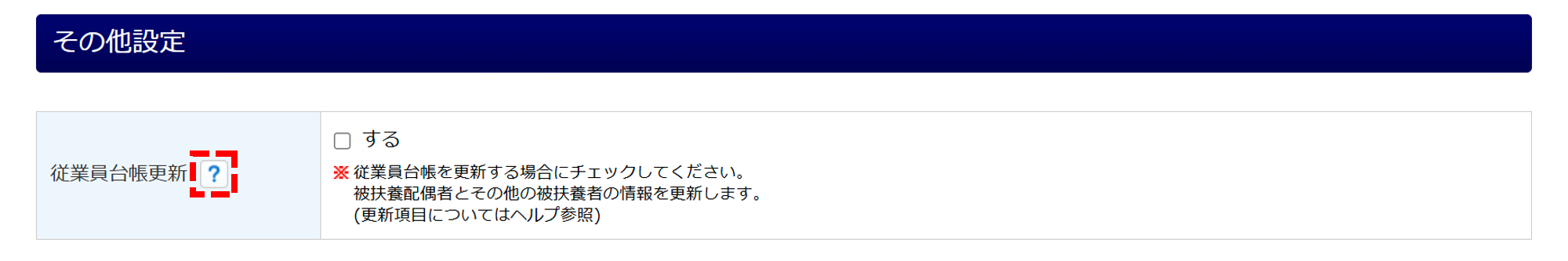 「従業員台帳更新」の「する」にチェックすると、本手続き画面で入力した内容を従業員台帳へ更新することができます。更新対象項目については、以下の補足をご確認ください。