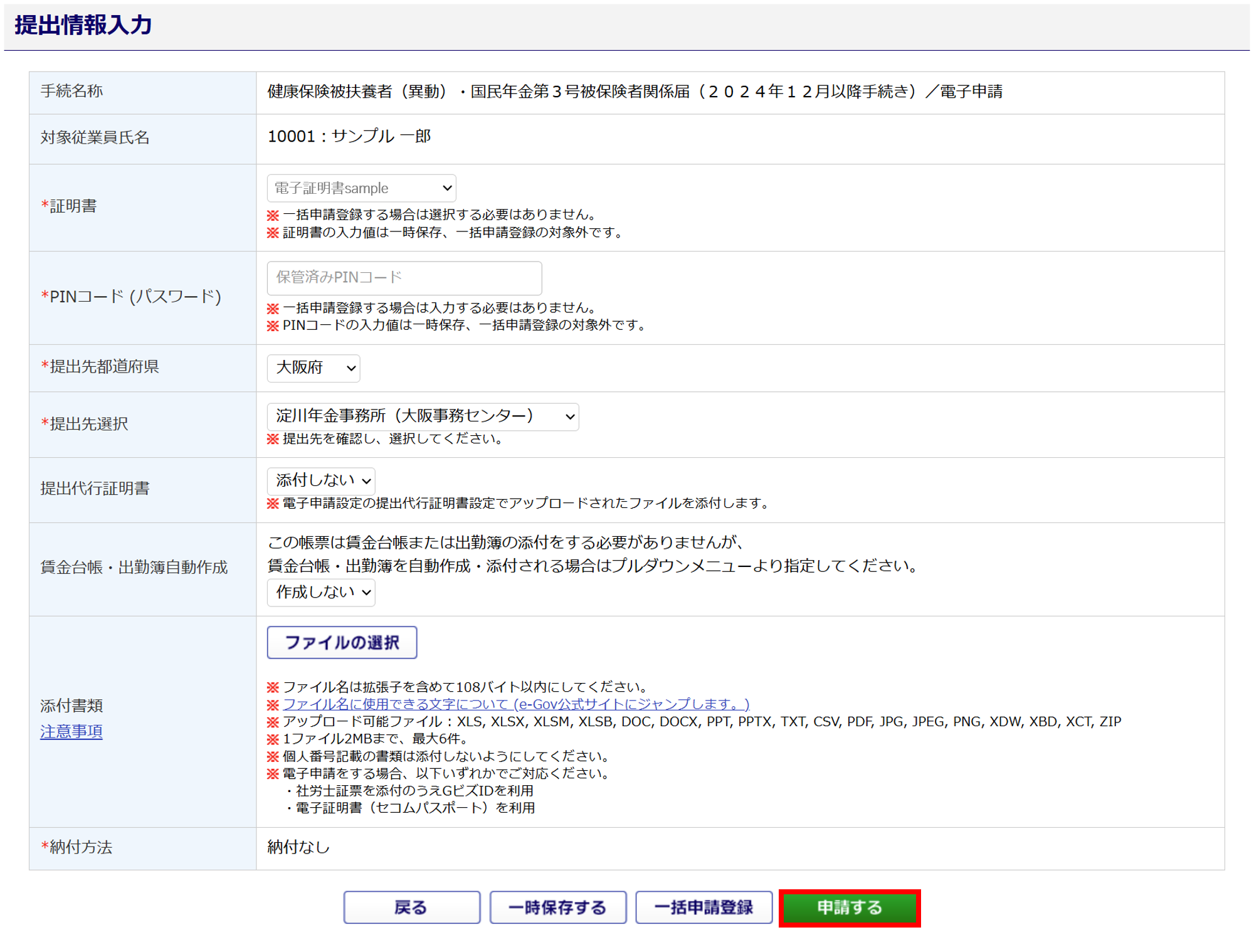システム上でご案内している「アップロード可能ファイル」については、あくまでもオフィスステーションにアップロードできるファイル形式です。e-Gov経由で電子申請をおこなう場合、手続きごとに添付できるファイル形式が異なりますので、ご注意ください。