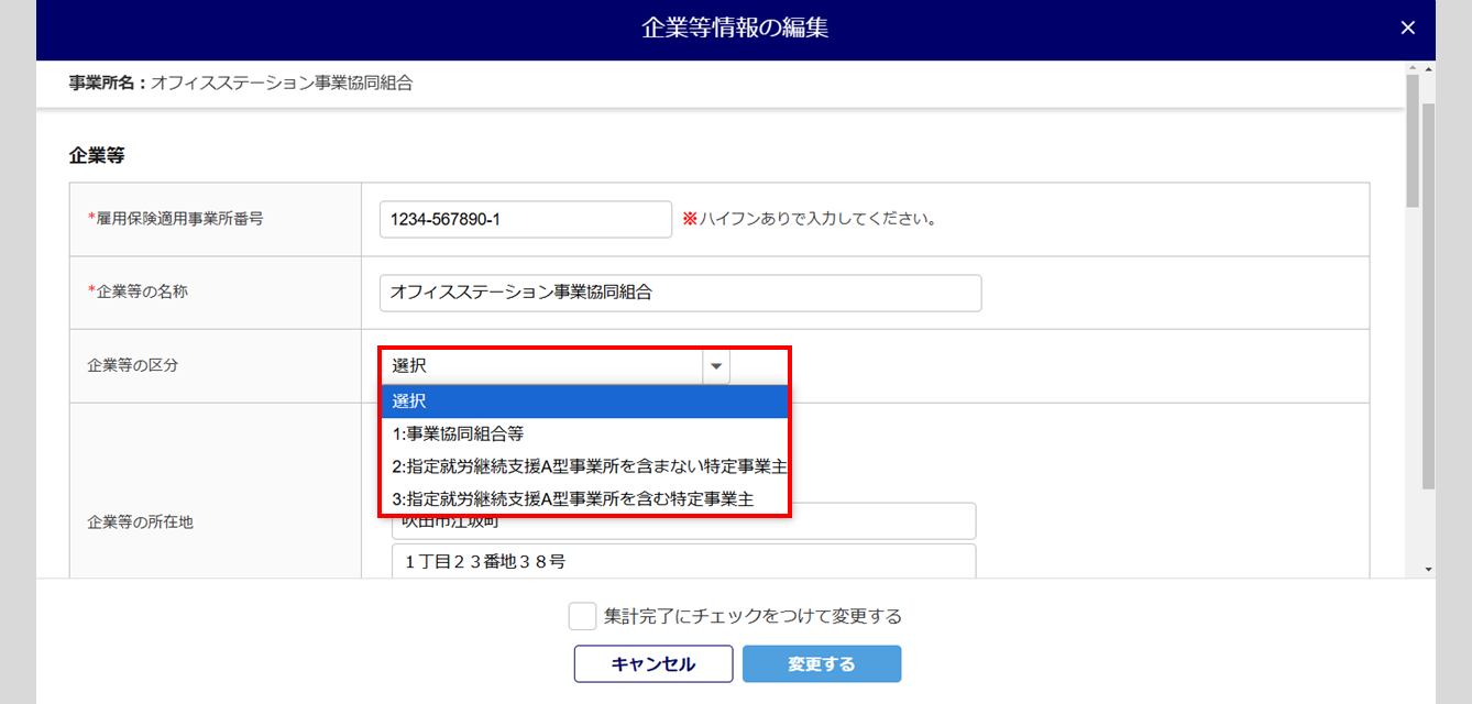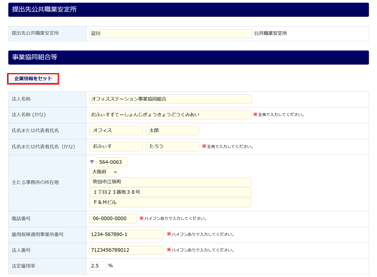 提出先公共職業安定所、事業協同組合の各項目に「企業設定」もしくは、「士業用顧問先管理」の情報が反映されます。