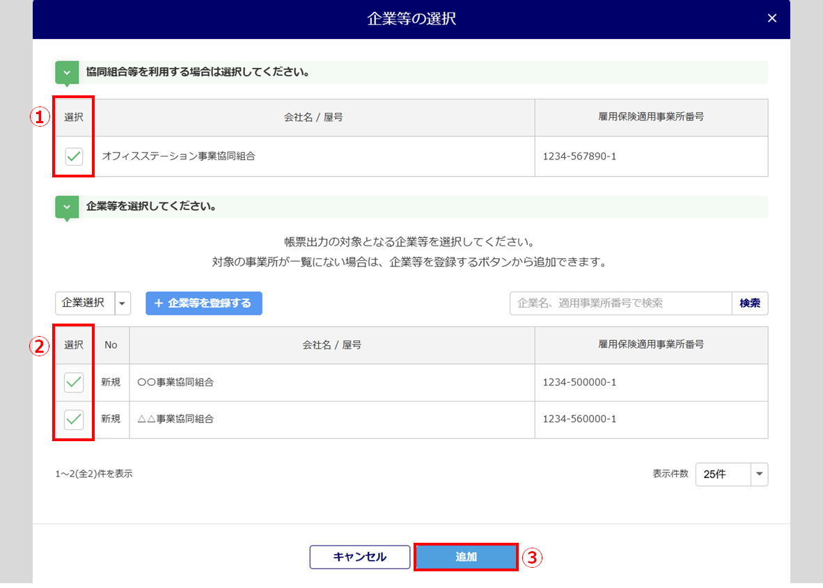 協同組合等の「選択」列()と帳票出力の対象となる企業等の「選択」列()にチェックし、[追加]()をクリックします。