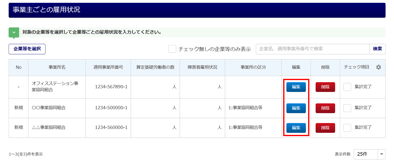 「編集」列の[編集]をクリックし、事業主ごとに雇用状況を入力します。