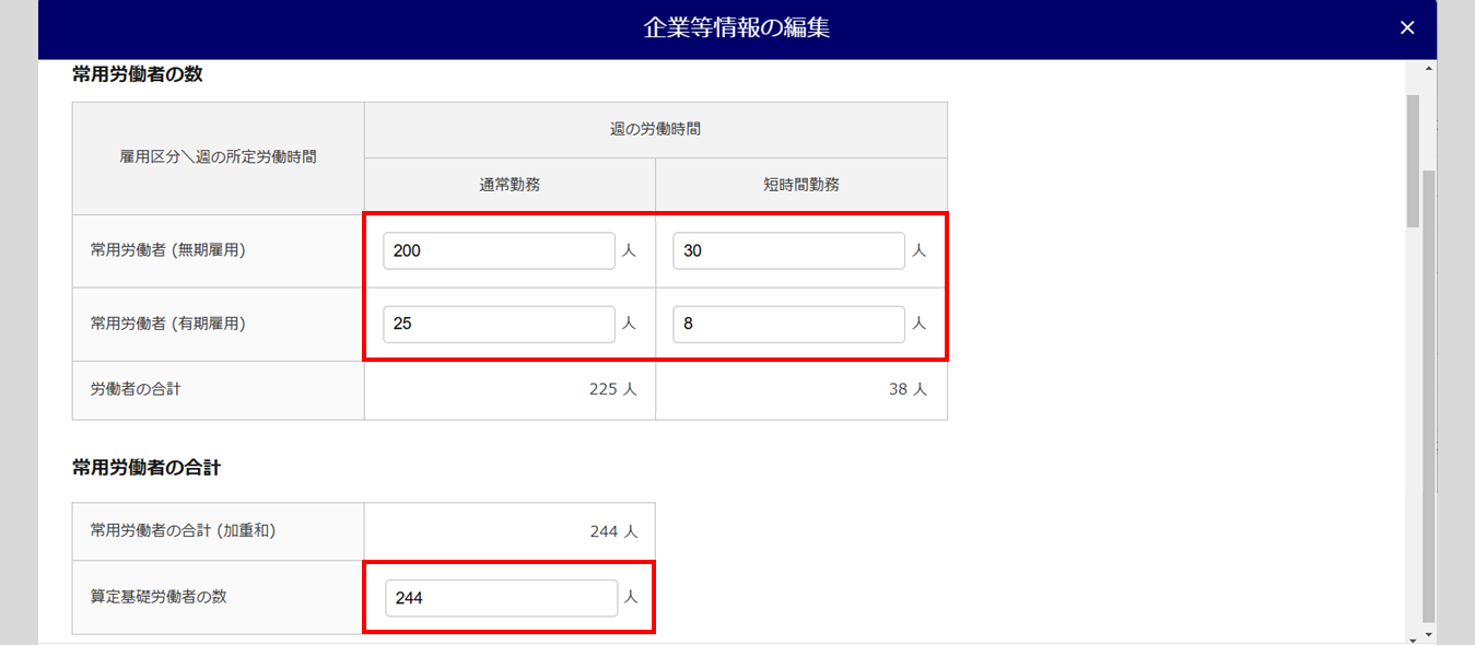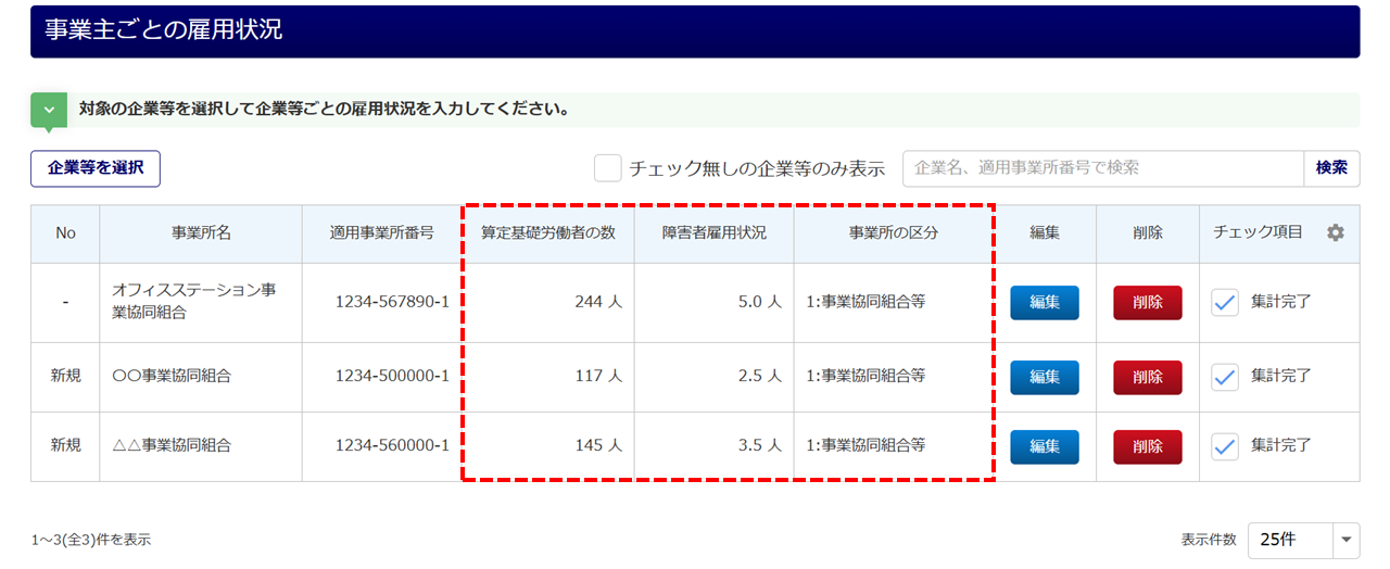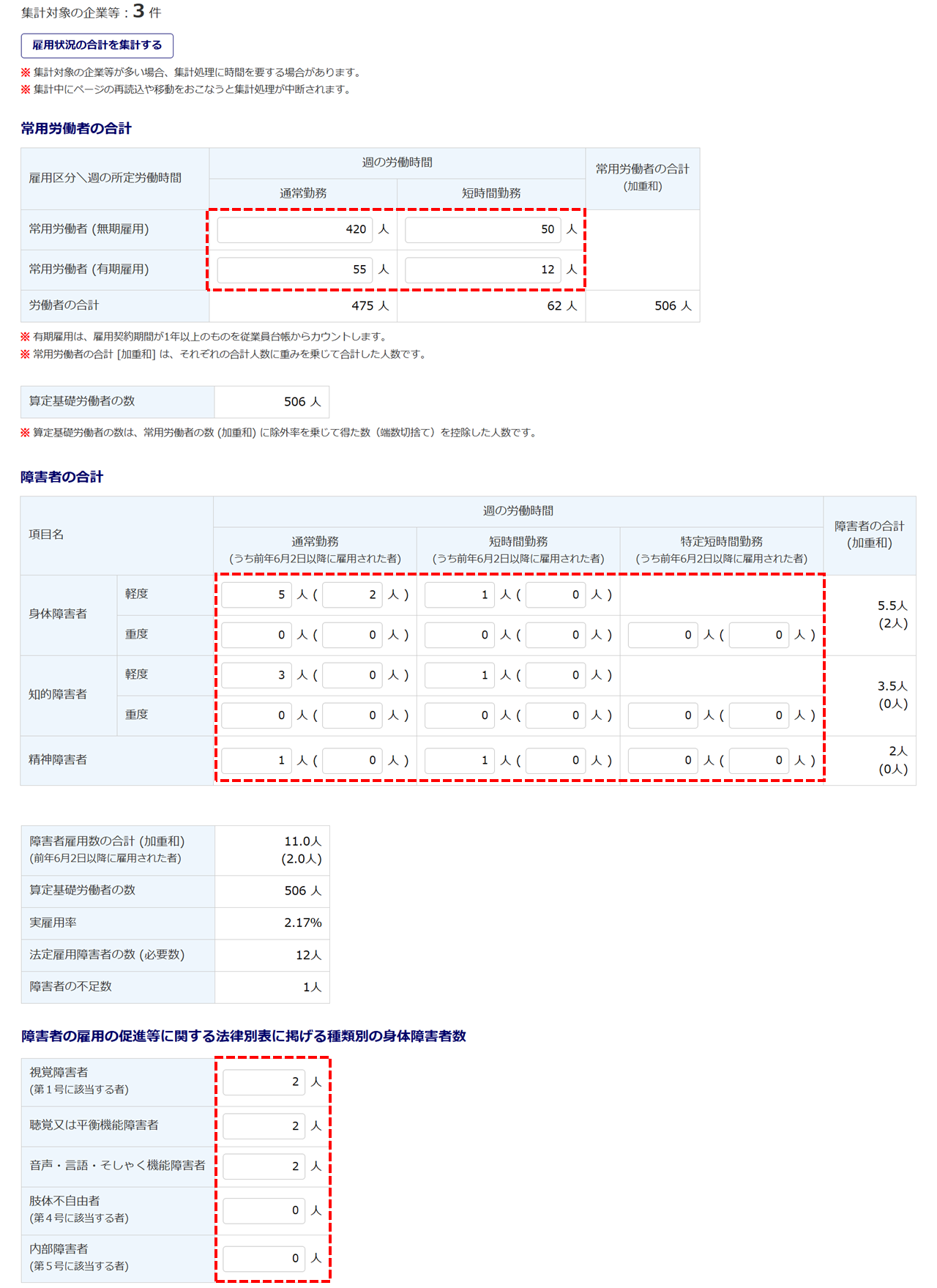 「事業主ごとの雇用状況」欄にて入力した情報が集計され、下図の赤破線枠部分に反映されます。