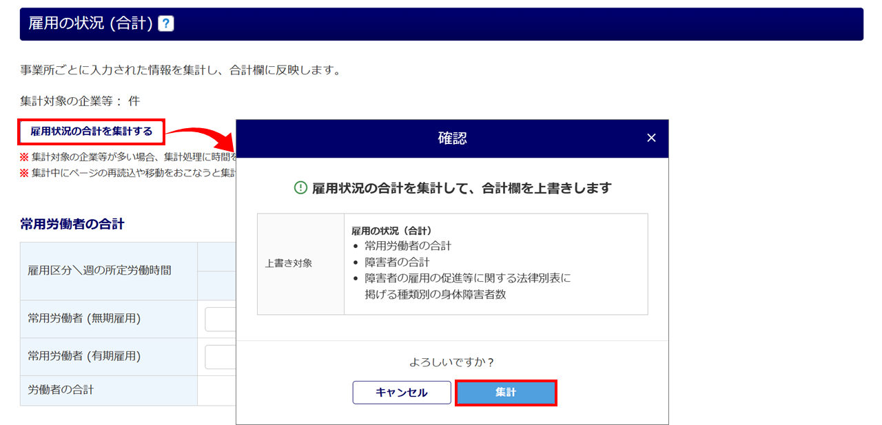 [雇用状況の合計を集計する]>[集計]をクリックします。