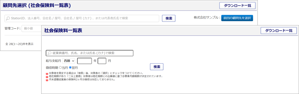 以前作成した社会保険料一覧表情報を出力したい場合は、「顧問先選択(社会保険料一覧表)」画面、もしくは、対象顧問先企業「社会保険料一覧表」画面の右上の[ダウンロード一覧]ボタンから出力できます。