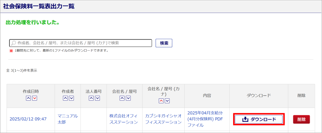 「CSV/PDFファイル」欄に表示される情報は、直近で作成した社会保険料一覧表情報のみとなります。
