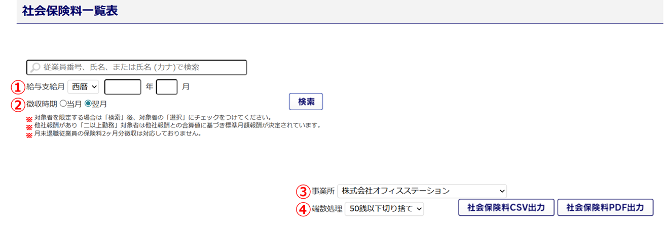 | ① | 給与支給月 | 設定した内容は、社会保険料一覧表の「○○○○年○○月支給分(○○月分保険料)」部分へ反映されます。 |