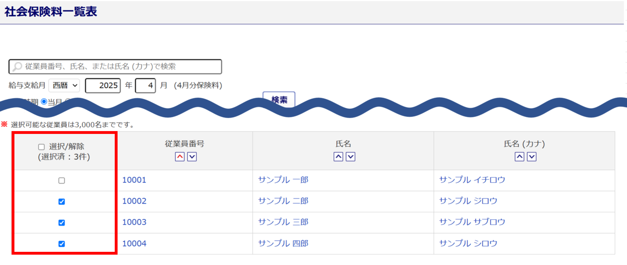 社会保険料一覧表を出力する対象者の「選択/解除」列にチェックします。