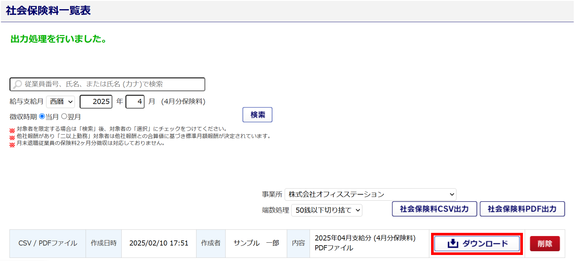 「CSV/PDFファイル」欄に表示される情報は、直近で作成した社会保険料一覧表情報のみとなります。