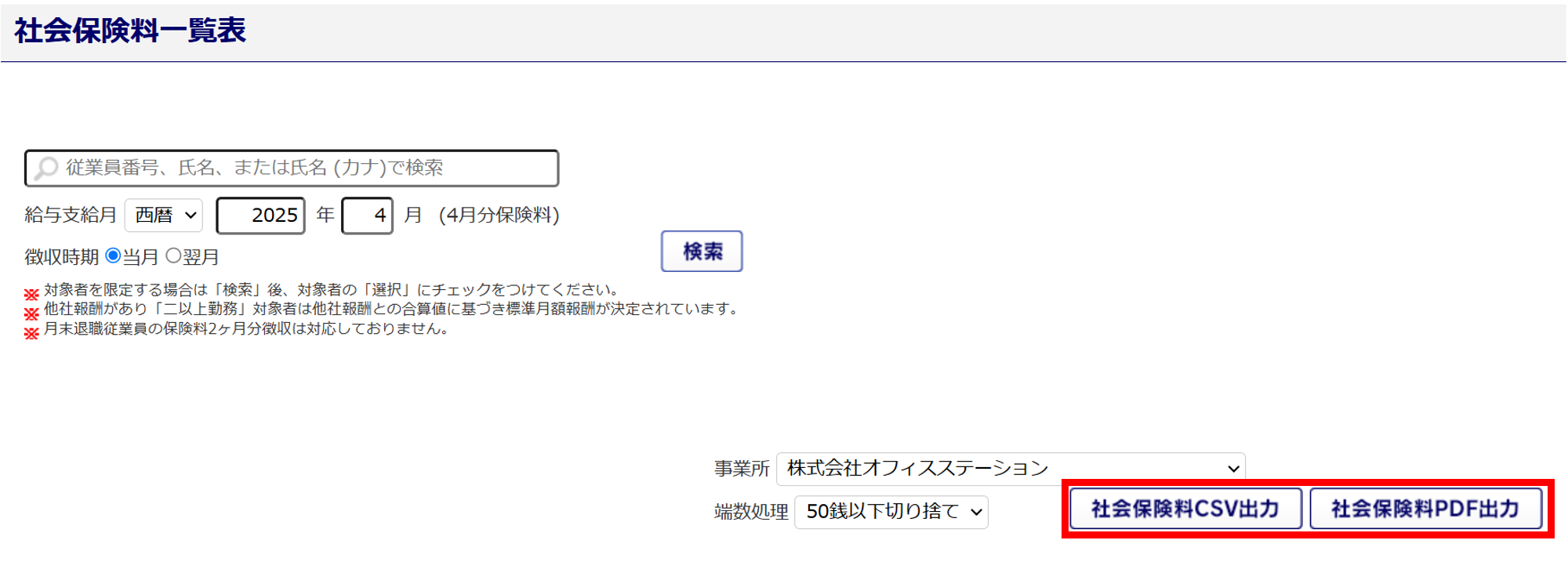 なお、出力時のファイル名は「社会保険料一覧表_会社名.csv」もしくは「社会保険料一覧表_会社名.pdf」です。
