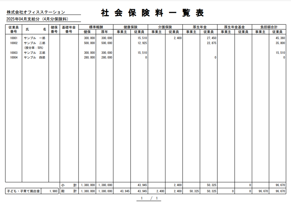 「健康保険」「介護保険」「厚生年金」「厚生年金基金」「負担合計額」項目の『事業主』列は、「総計/合計」のみが表示され、従業員ごとの金額に関しては、空欄で出力されます。