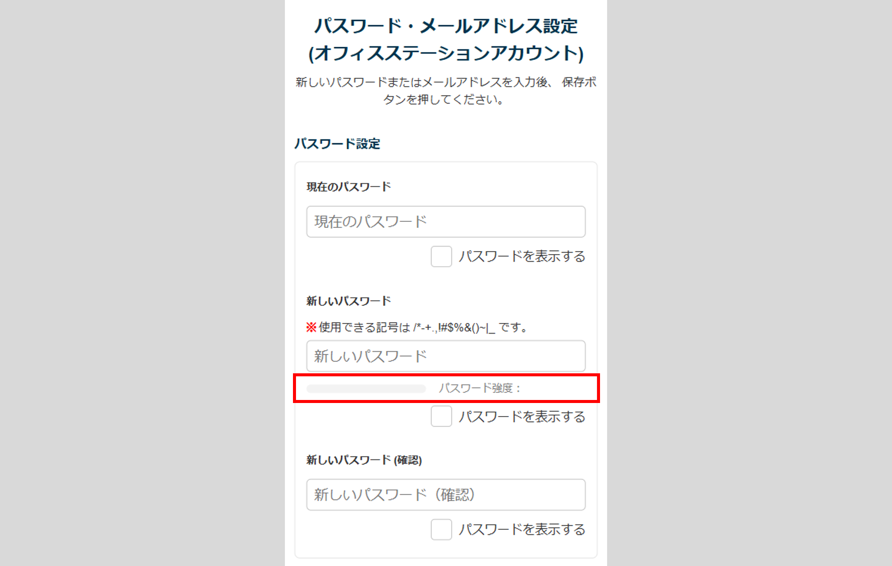 従業員がパスワードを変更時「新しいパスワード」を入力すると、入力されたパスワードの強度について「パスワード強度」に判定結果を表示します。