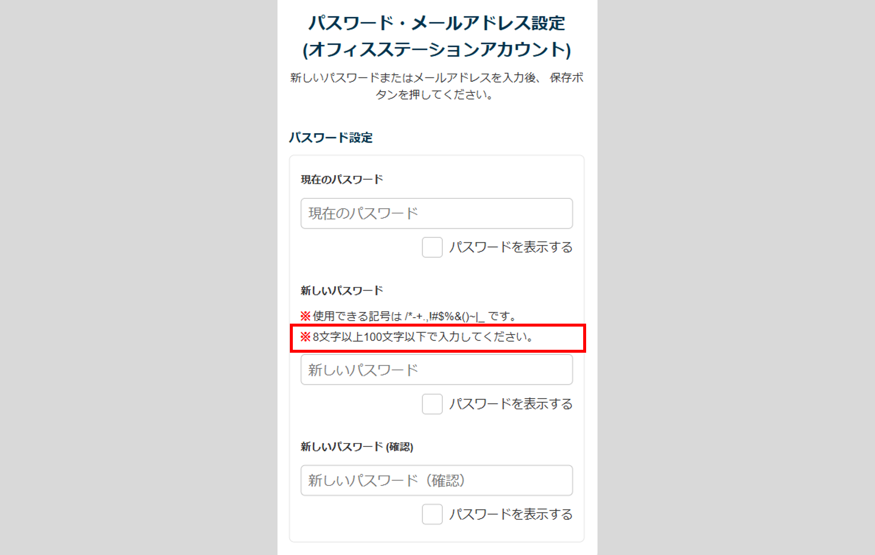 「従業員がパスワード変更する際のパスワードポリシー」で設定した条件が、従業員のパスワード設定画面に表示されます。