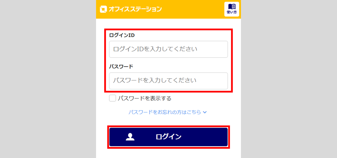 従業員マイページのログイン画面を開き、「ログインID」「パスワード」を入力し、[ログイン]をクリックします。