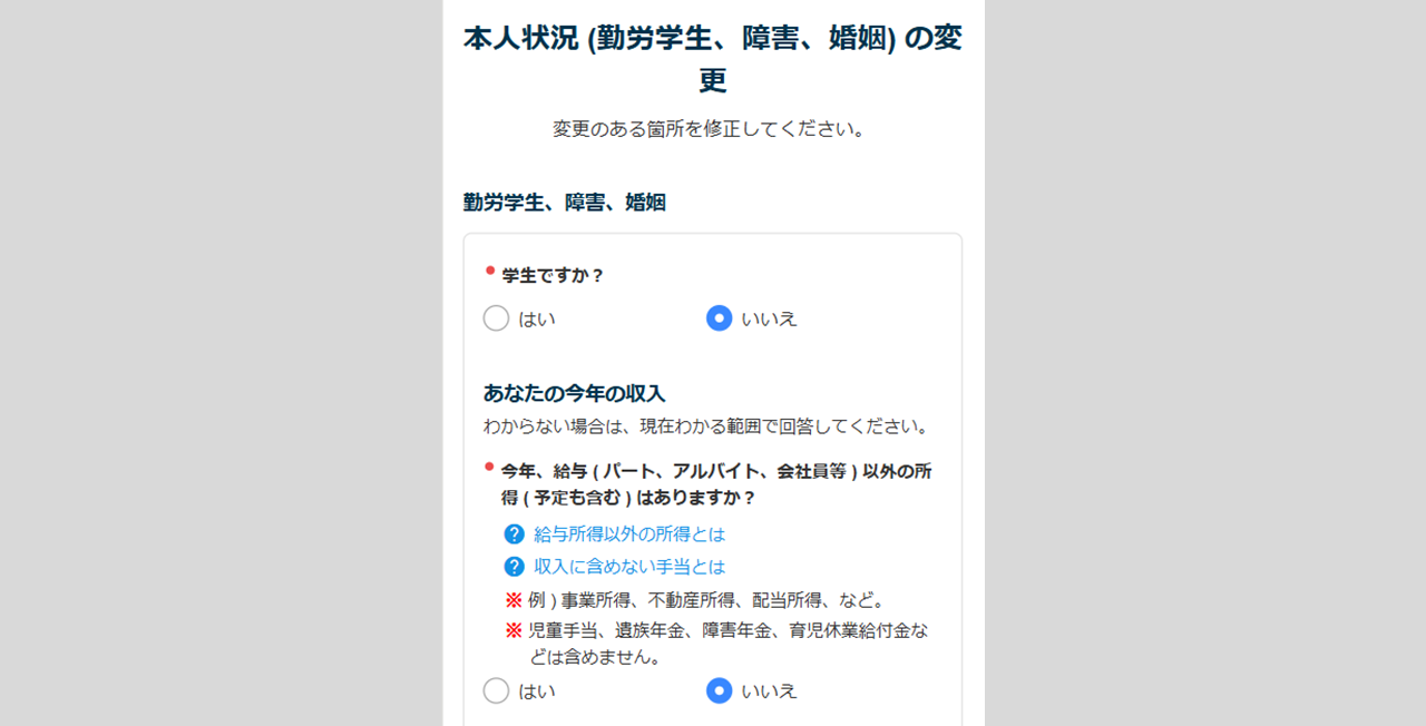 『?給与所得以外の所得とは』『?収入に含めない手当とは』のように、青文字で書かれた箇所をクリックすると、入力に役立つヒントが表示されますのでご活用ください。