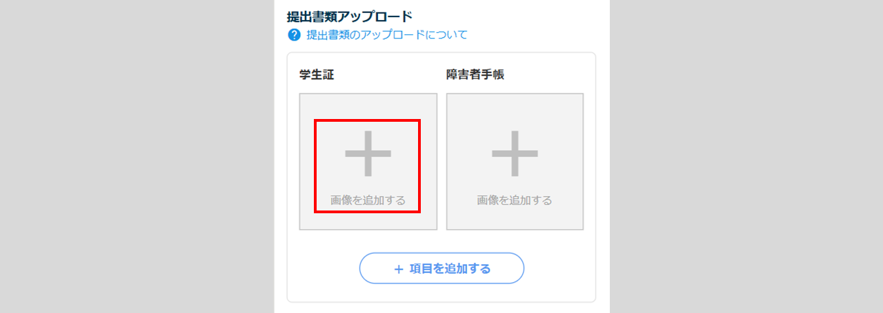 「学生ですか?」に「はい」を選択していると「学生証」が、「障害者手帳をお持ちですか?」に「はい」を選択を選択していると「障害者手帳」が、提出書類として表示されます。
