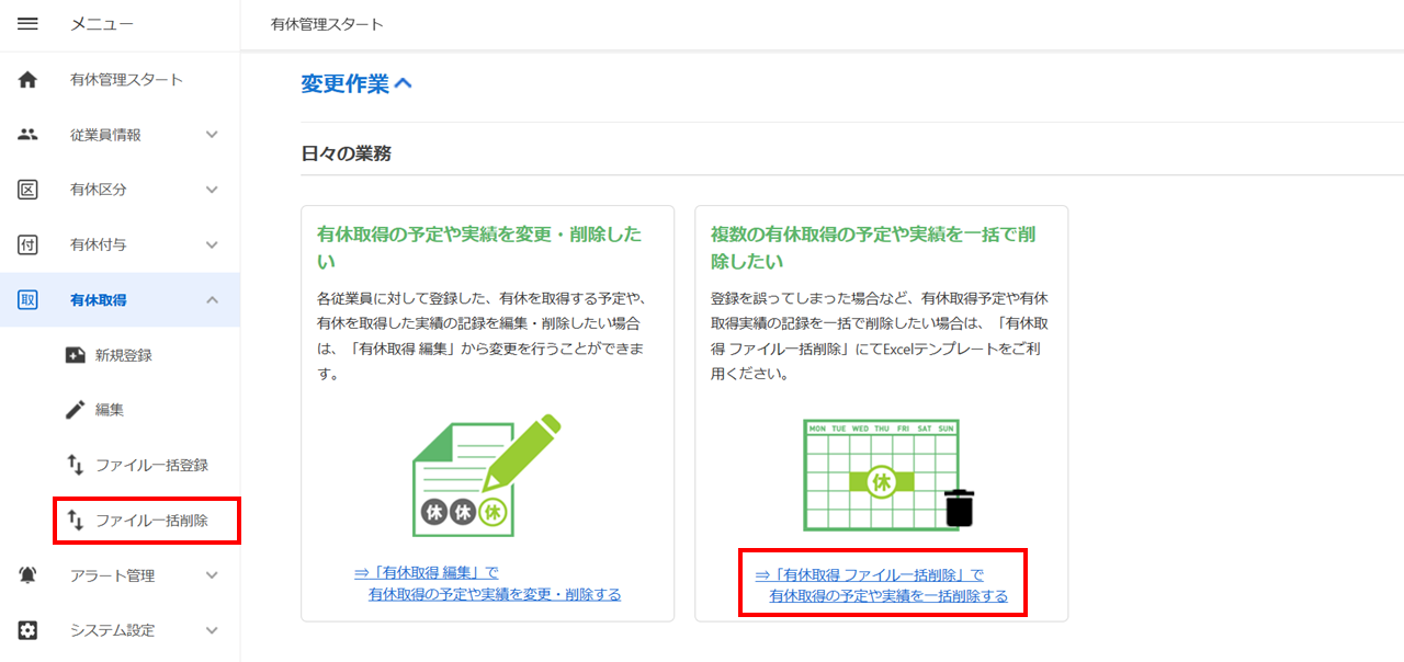 または、「変更作業・日々の業務」内[「有休取得 ファイル一括削除」で有休取得の予定や実績を一括削除する]をクリックします。